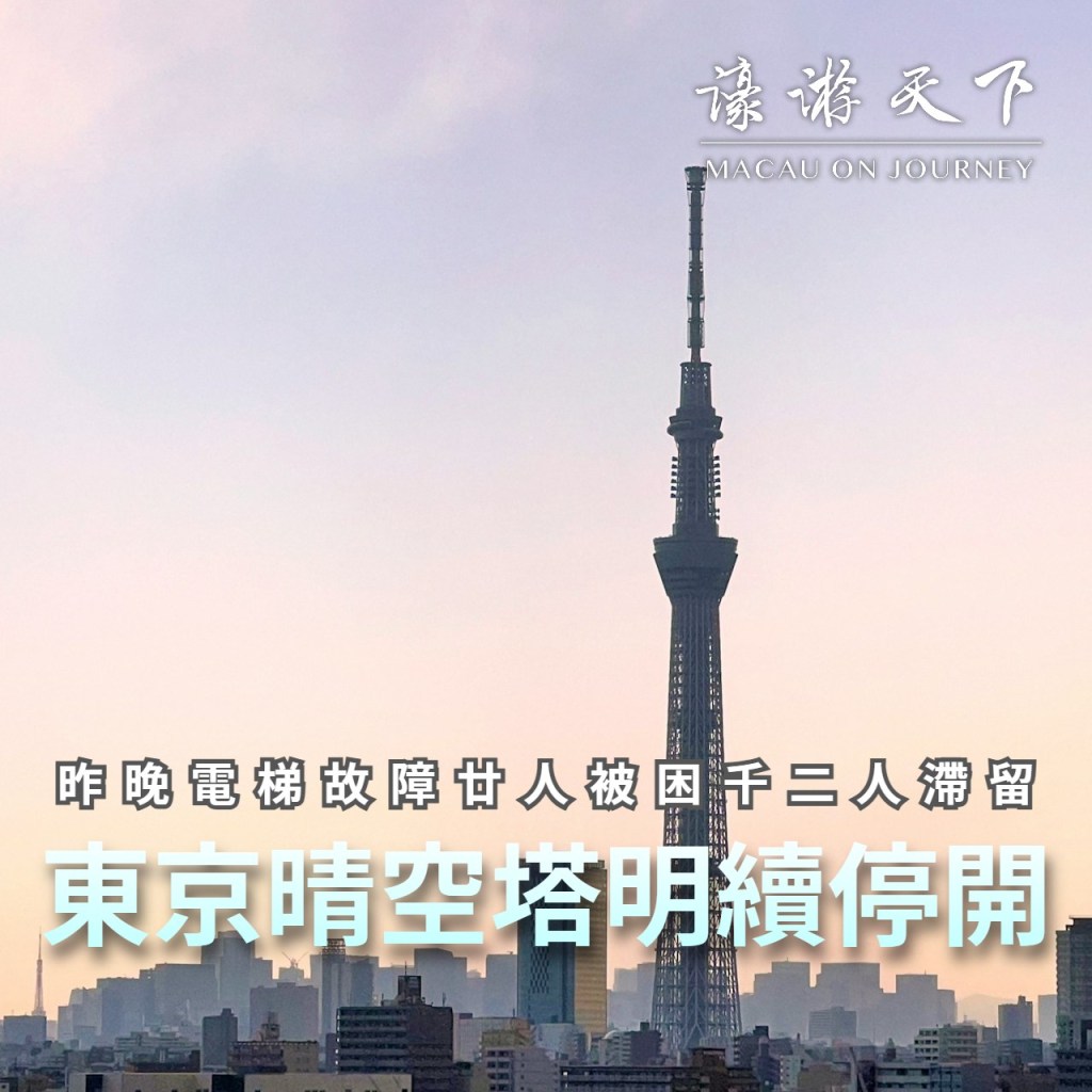 日本東京著名景點晴空塔昨晚電梯故障,導致二十人被困、約一千二百人滯留。營運方宣佈今明兩日暫停開放。