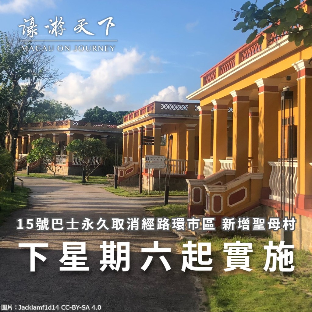 交通事務局宣佈,下星期六(4月11日)起調整兩條巴士路線,其中15號巴士永久取消途經路環市區及黑沙,改為採用九澳高頂馬路走線,並延伸至九澳聖母村。