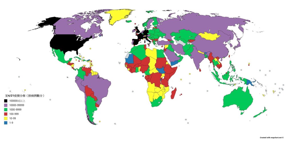 西班牙確診病例累計204178宗、21282死。義大利累計183957宗確診病例,另有24648人死亡。法國178172宗、20796死。德國148291宗、5033死。英國129044宗、17337死。