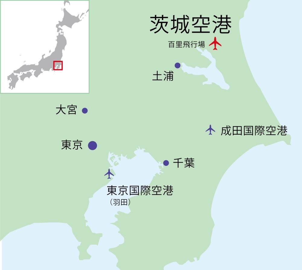 茨城機場位於東京東北85公里,是東京首都圈繼羽田、成田後第三個機場。最初是航空自衛隊百里基地,2010年開放民用。現有國際航線前往台北(桃園)、內地上海浦東和西安。