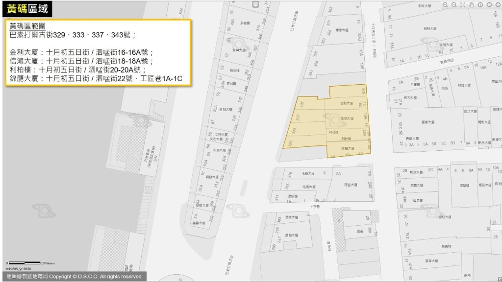 中心又宣佈,巴素打爾古街329、333、337、343號;十月初五日街 / 泗𠵼街16-16A號金利大廈、18-18A號信鴻大廈、20-20A號利柏樓;十月初五日街 / 泗𠵼街22號及工匠巷1A-1C錦龍大廈被列為黃碼區。