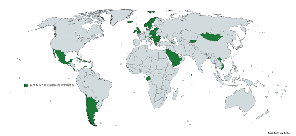 至今全球已經有四十六個國家和地區,撤銷入境防疫限制,分別是: