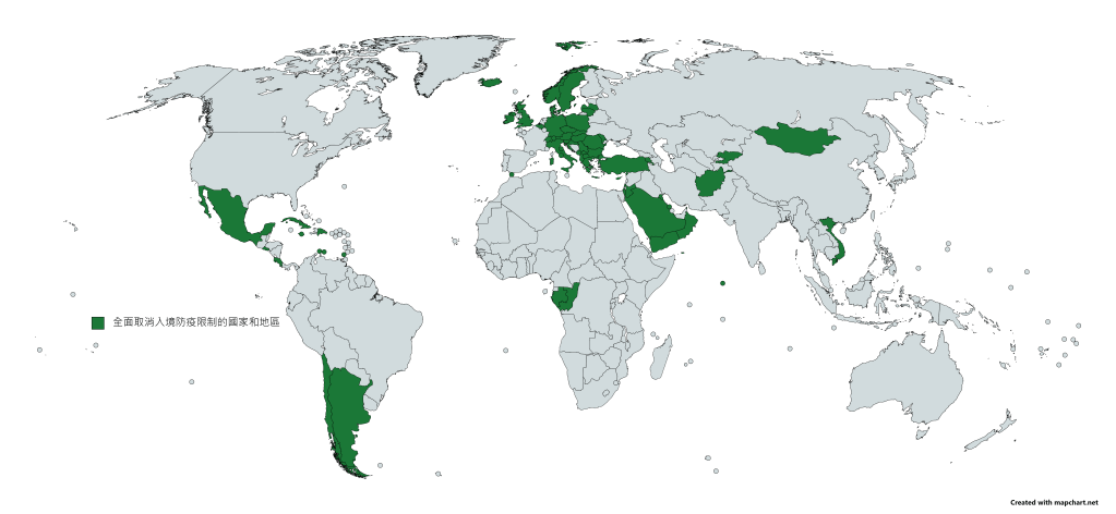 至今全球已經撤銷入境防疫限制的國家和地區,分別是: