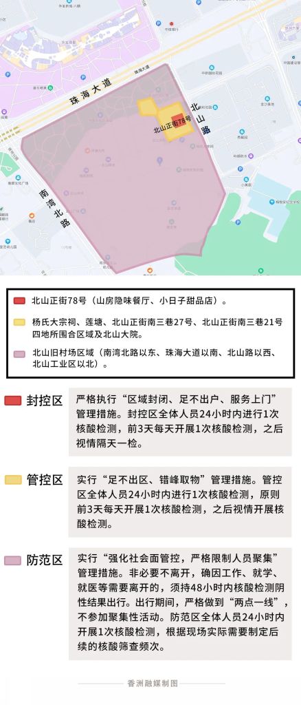 珠海市香洲區新型冠狀病毒肺炎疫情防控指揮部昨日至今日上午先後發佈通告,將南屏北山、橫琴、拱北圍基等地區分別劃為封控、管控、防範區,暫定為期七日。拱北街道全域、前山街道白石社區,以及橫琴粵澳深度合作區更於今日凌晨五時以及今晨九時起實施臨時交通管制,暫定為期三日。