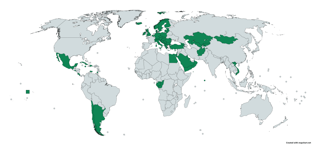 蒙古、馬爾代夫、沙特阿拉伯、約旦、巴林、也門、亞美尼亞、吉爾吉斯、越南、科威特、阿富汗、阿曼、塞浦路斯、以色列、土耳其、哈薩克、烏茲別克、格魯吉亞