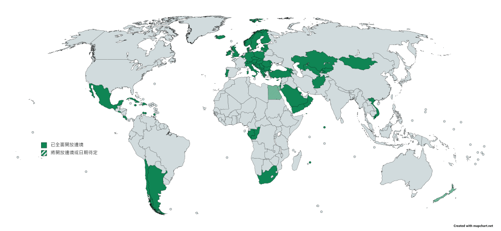 至今全球已經撤銷入境防疫限制的國家和地區,分別是: