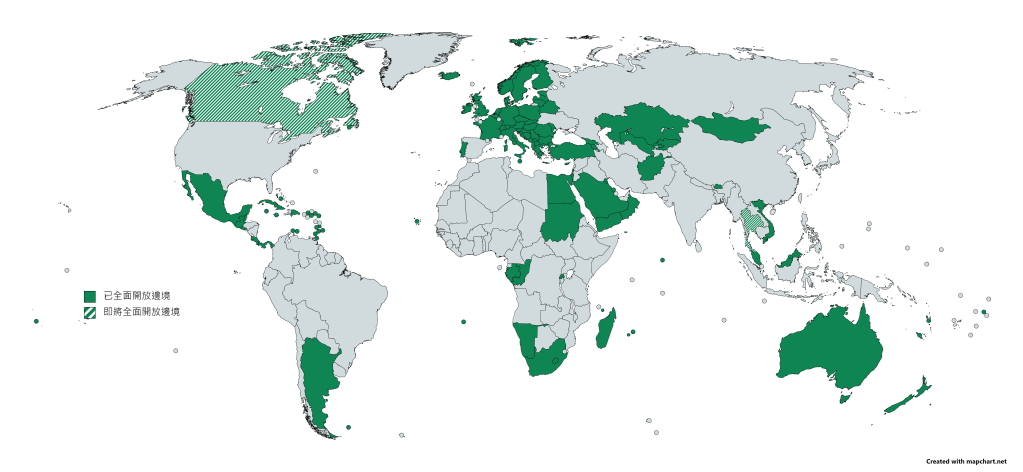 至今全球已經撤銷入境防疫限制的國家和地區,分別是: