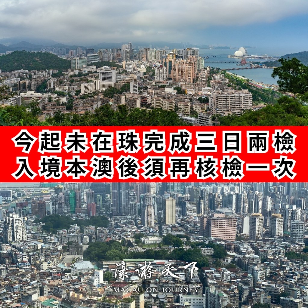 新型冠狀病毒感染應變協調中心表示,因應內地各地疫情變化,為配合珠海市實施由外地到珠海市人士「三日兩檢」的措施,由今日上午6時起,由珠海市、中山市坦洲鎮及三鄉鎮以外地方經珠海市入境本澳的人士,如未在珠海市完成「三日兩檢」的措施,入境本澳後須至少在當日或次日接受一次核酸檢測,檢測採樣時間與上次(包括在珠海市進行的一次)採樣至少相隔12小時。