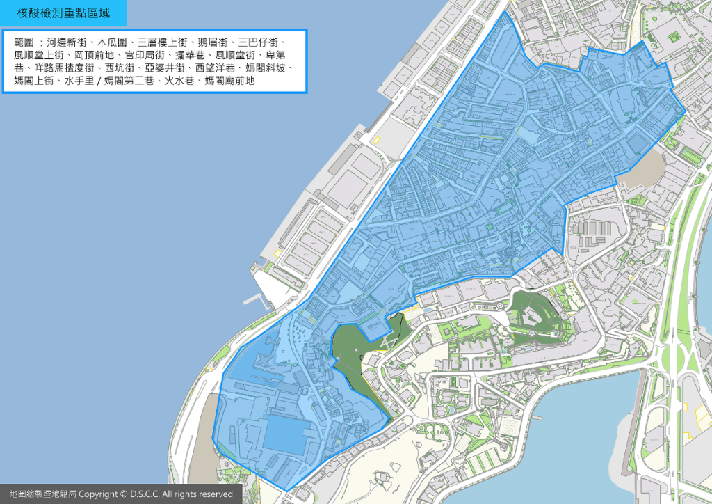 - 11月18日在河邊新街、木瓜圍、三層樓上街、鵝眉街、三巴仔街、風順堂上街、岡頂前地、官印局街、擺華巷、風順堂街、卑第巷、咩路馬揸度街、西坑街、亞婆井街、西望洋巷、媽閣斜坡、媽閣上街、水手里/媽閣第二巷、火水巷丶媽閣廟前地居住、工作或到過該區域停留半小時以上的人士。