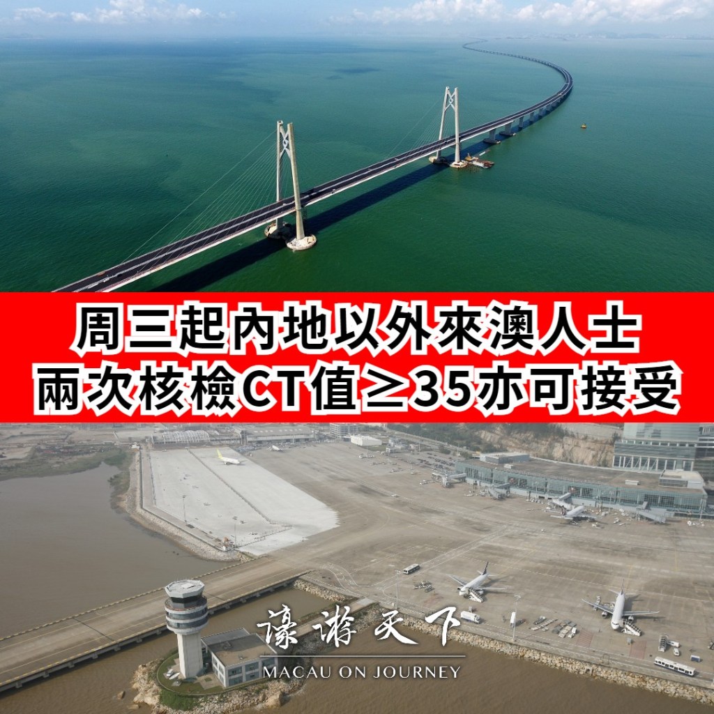 新型冠狀病毒感染應變協調中心晚上宣佈,星期三起自內地以外地區來澳人士,同時出示兩份結果為陽性但CT值均為≥35的核酸檢測證明,亦可登上前往澳的交通工具。