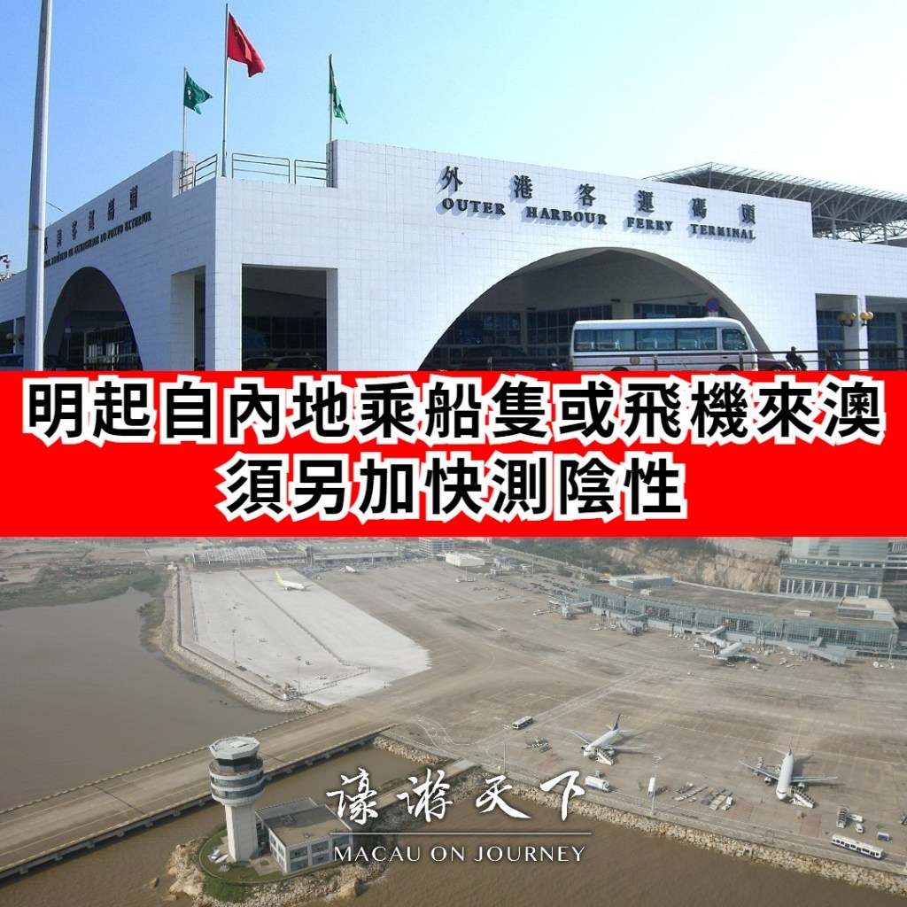 內地疫情持續,本澳決定收緊乘客飛機和船隻自內地入境人士的防疫措施。明日起除核酸報告外,並須在預定登機、登船前三小時內進行快速抗原檢測,結果為陰性並將結果上載到澳門健康碼,才可登機或登船。