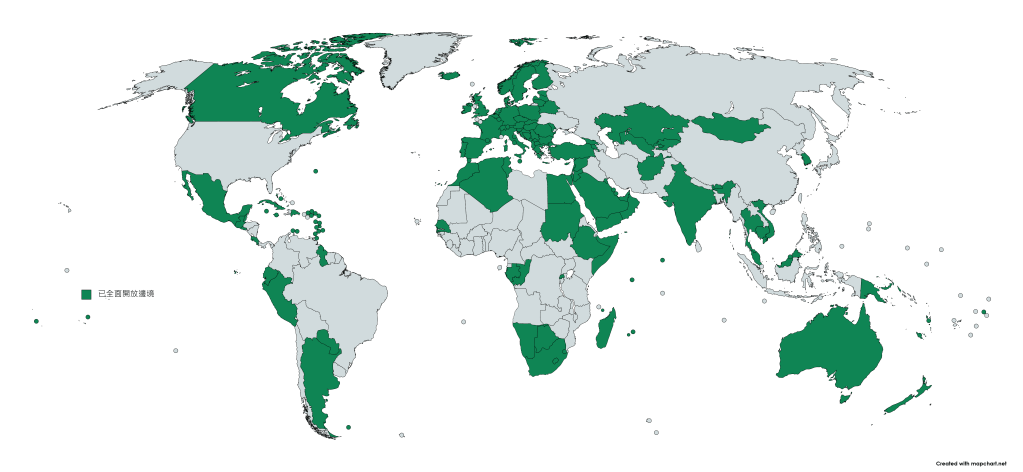 至今全球已經撤銷入境防疫限制的國家和地區,分別是: