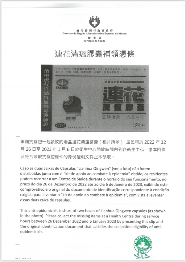 應變協調中心表示,抗疫包的派發工作已經進入最後一天。本澳已經順利採購150萬盒連花清瘟膠囊,並分批抵達澳門,但由於內地疫情關係及部份藥品在內地運送過程中被壓壞,影響部份連花清瘟膠囊運抵本澳時間,因此,昨日部分抗疫包將附有蓋有衛生局印章的「連花清瘟膠囊補領憑條」(憑條式樣請參閱附圖),獲發憑條的人士可本月26日至下月6日於衛生中心開放時間內到衛生中心,出示憑條正本及符合領取抗疫包條件的身份證明文件正本,補領兩盒連花清瘟膠囊。憑條不可轉讓。