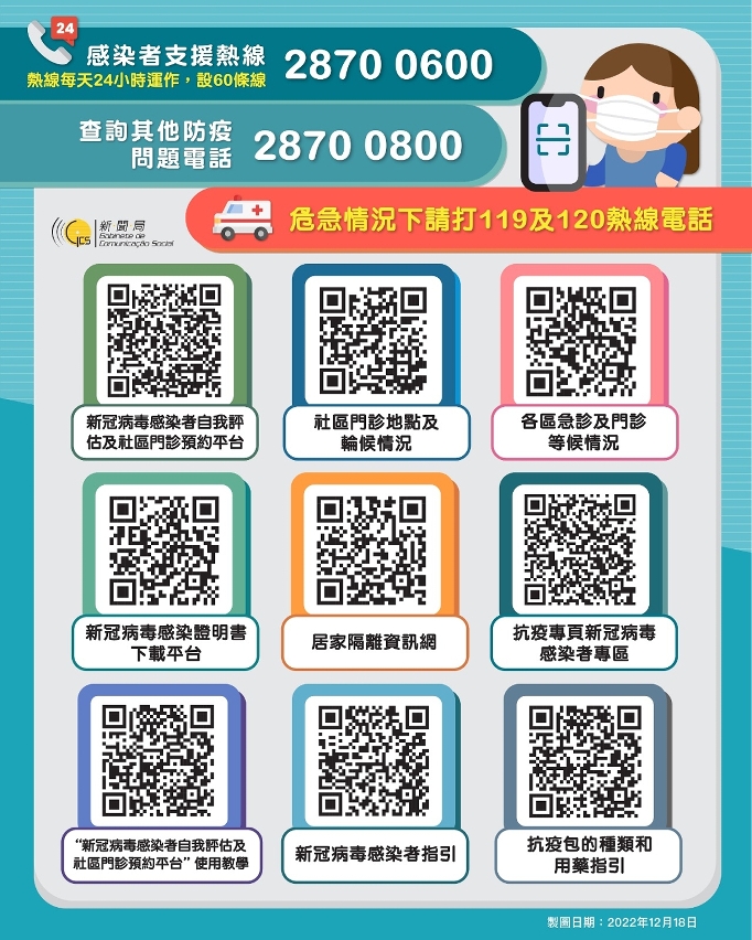 為應對本澳疫情變化,應變協調中心持續動態研判社區門診的站點設置,以方便居民就診和平衡居民生活上的需求。除今日起增加前路環中葡學校作為社區門診外,將於12月20日(星期二)起增加前北區中葡小學、康公廟休憩區及白鴿巢公園3個社區門診,以及12月21日(星期三)起再增加南灣中巷(近英皇酒店)社區門診。此外,應變協調中心不斷優化各區社區門診的應診能力,將在東方明珠街休憩區及氹仔運動場圓形地的社區門診增加診室以滿足居民需求。社區門診的巴士專線亦將增設接載站點便利居民就診。