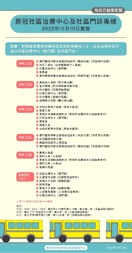 新型冠狀病毒感染應變協調中心表示,由今日起,除原有C02-C06新冠社區治療中心及社區門診巴士專線外,將新增一條巴士專線C07,以方便對核酸單管檢測陽性或自測抗原陽性人士,且未具條件自行前往社區治療中心(澳門蛋)及社區門診就診。