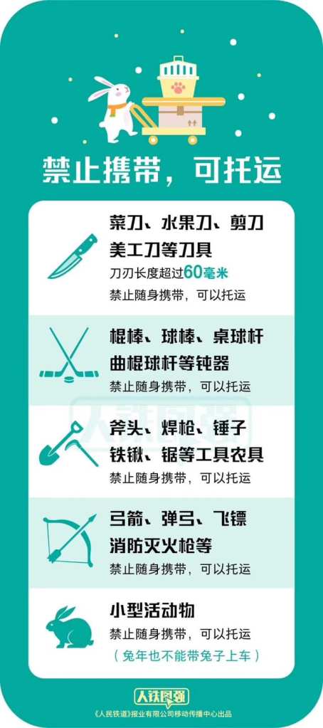 明日年廿八,內地將會出現回鄉度歲的高峰期。鐵路部門提醒,乘坐火車禁止、限制攜帶下列物品上車。