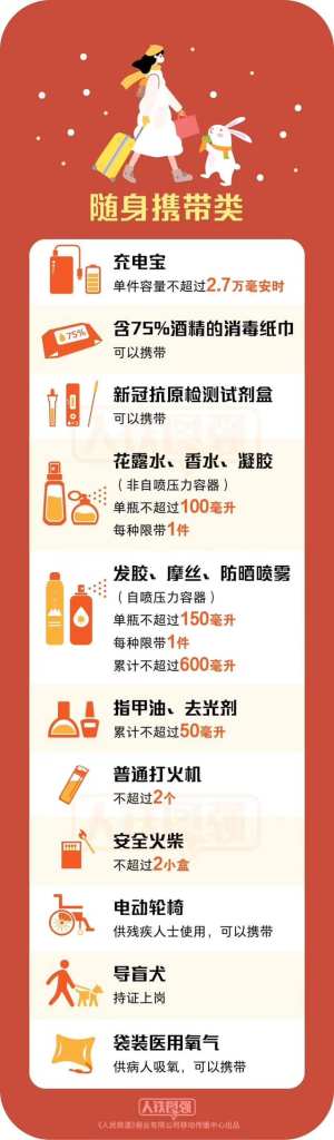 香煙不能超過50條。白酒累計不超過6瓶、容量不超過3公升,且須包裝密封完好、標誌清晰,酒精濃度限於70度及以下。散裝白酒不能通過安檢進站上車。