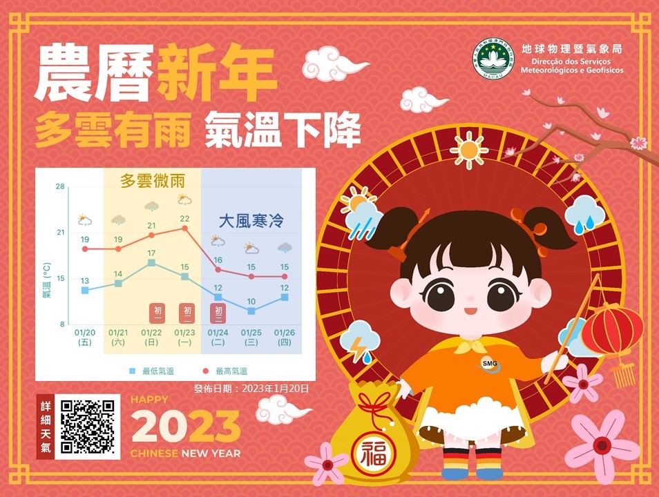 氣象局預料,除夕夜開始,本澳將轉受一股偏東氣流影響,天色漸轉多雲,預料年初一及年初二有幾陣微雨,年初三及年初四早上最低氣溫將再度降至寒冷水平。