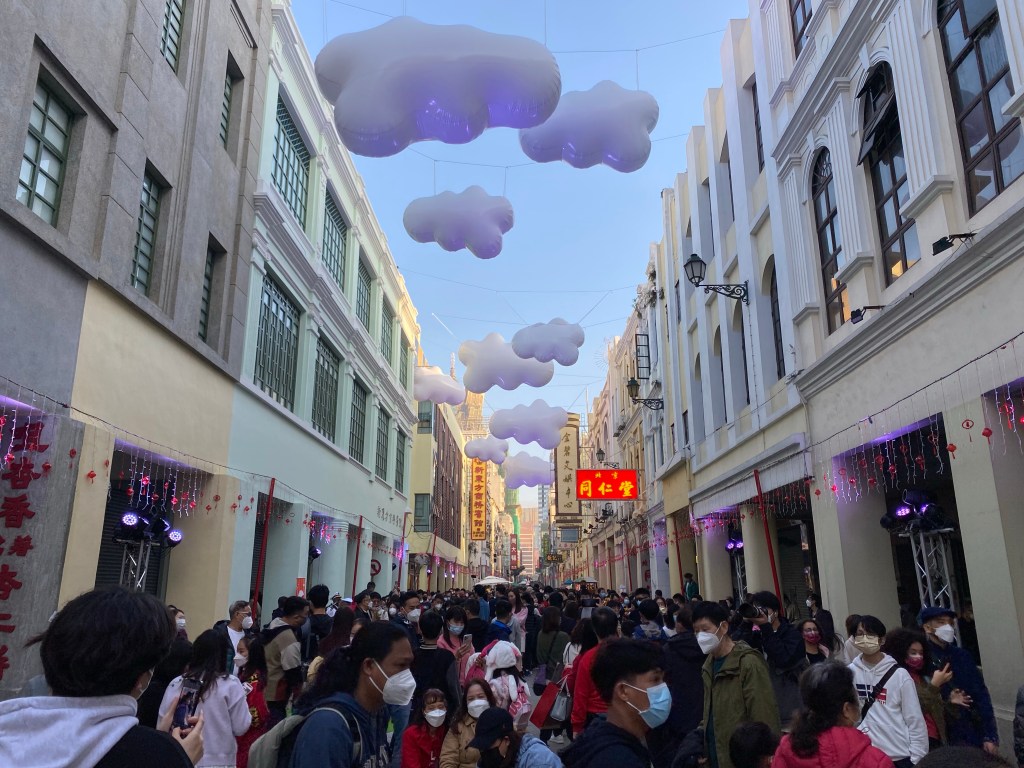 平時車水馬龍嘅新馬路,如今竟然係行人川流不息嘅景象。除咗馬路中間有座椅供人休息外,亦有巨型福兔,同其他裝置藝術供大家合照留念。兩傍仲有澳門非物質文化遺產演示,好似係龍鬚糖、印章製作,警察銀樂隊及各表演單位演奏,以及具澳門嘅特色文化創產品、小食攤檔,行到有啲餓有啲頸渴都可以解決一下。