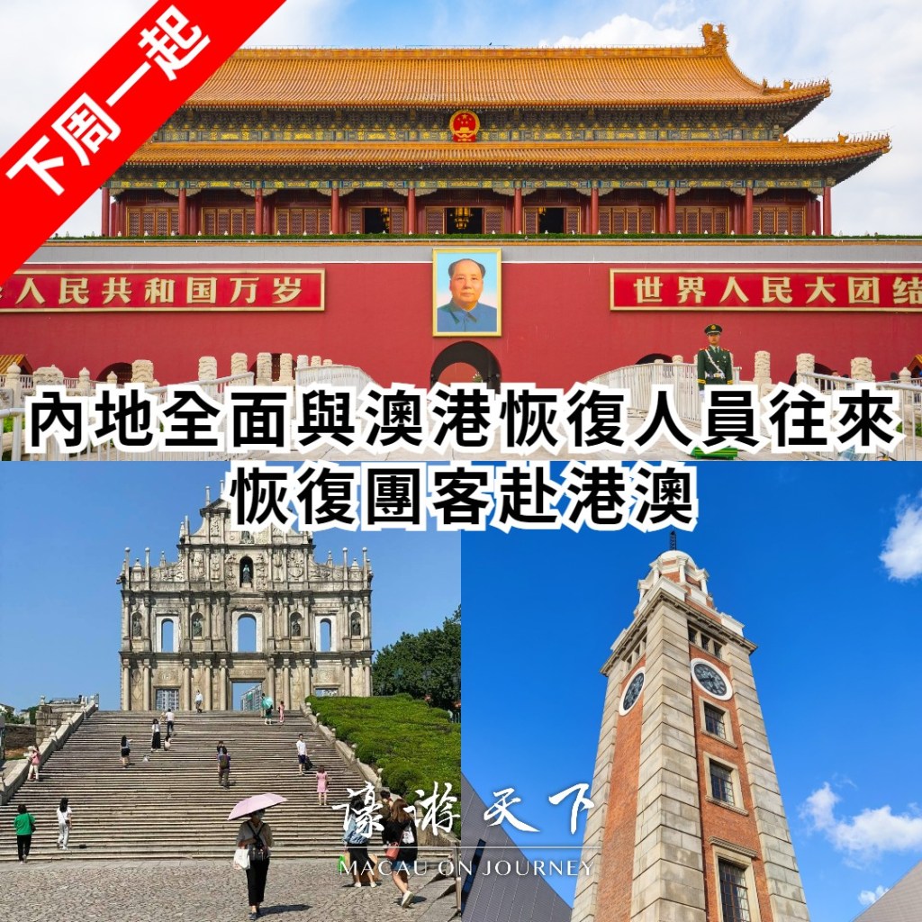 國務院聯防聯控機制公佈關於全面恢復內地與港澳人員往來的通知,下周一起內地全面與澳門香港恢復人員往來,當中包括恢復團客赴港澳旅遊。