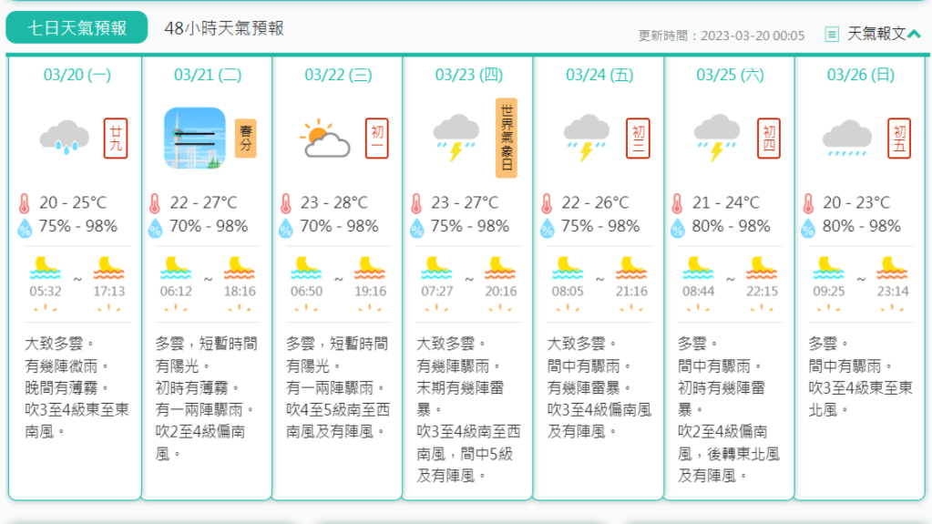 星期三起本澳漸轉吹西南風。星期四至星期六大致多雲,有幾陣驟雨,末期有幾陣雷暴。星期六後期轉吹東北風及有陣風。