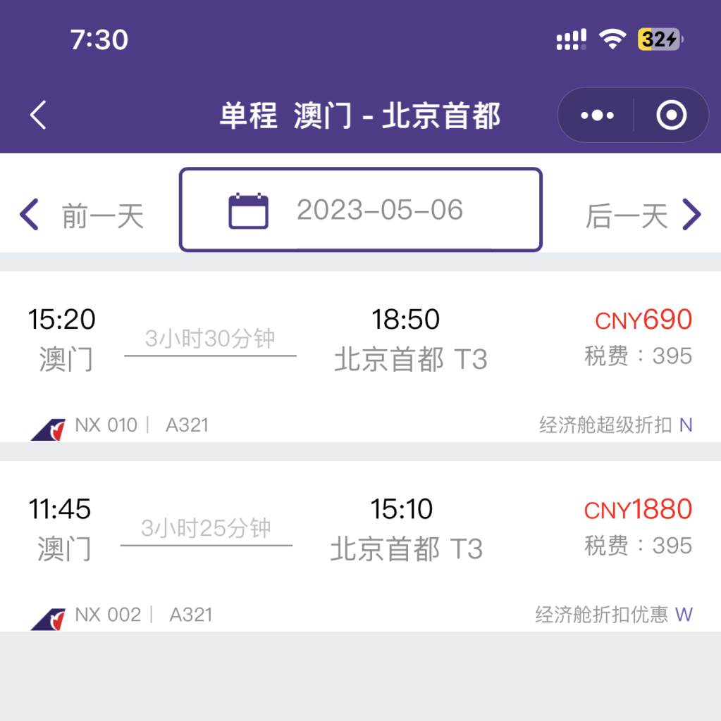根據實測,5月6日澳門至北京單程航班,淨票價690人民幣(折合約808澳門元),另稅費395元。