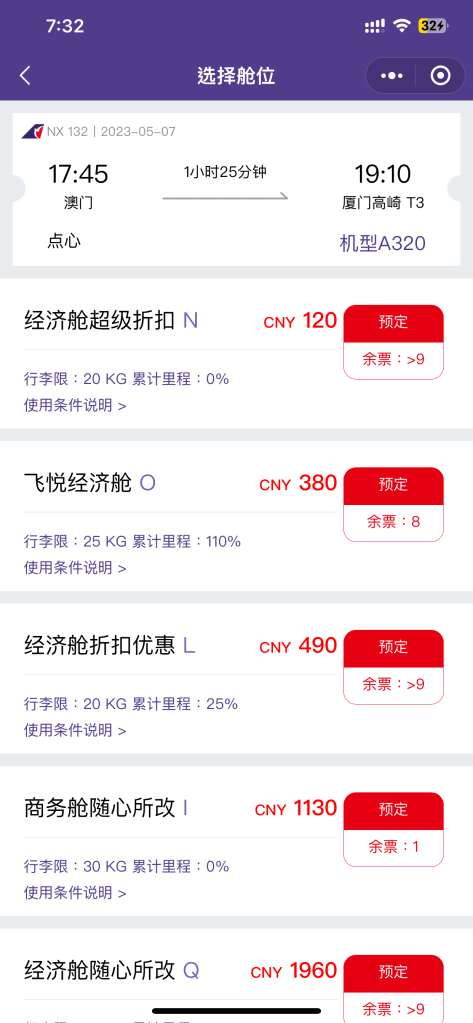 上海虹橋航線方面,5月6日澳門出發NX110,淨票價260人民幣(折合約305澳門元),另稅費395元。