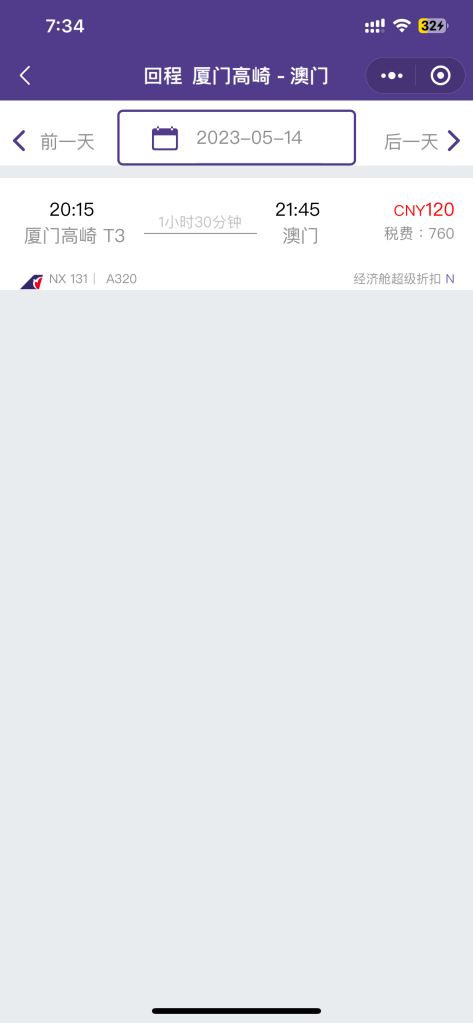 5月7日至14日,來往澳門及廈門,去程淨票價70人民幣(折合約82澳門元),另稅費395元,回程120元人民幣。