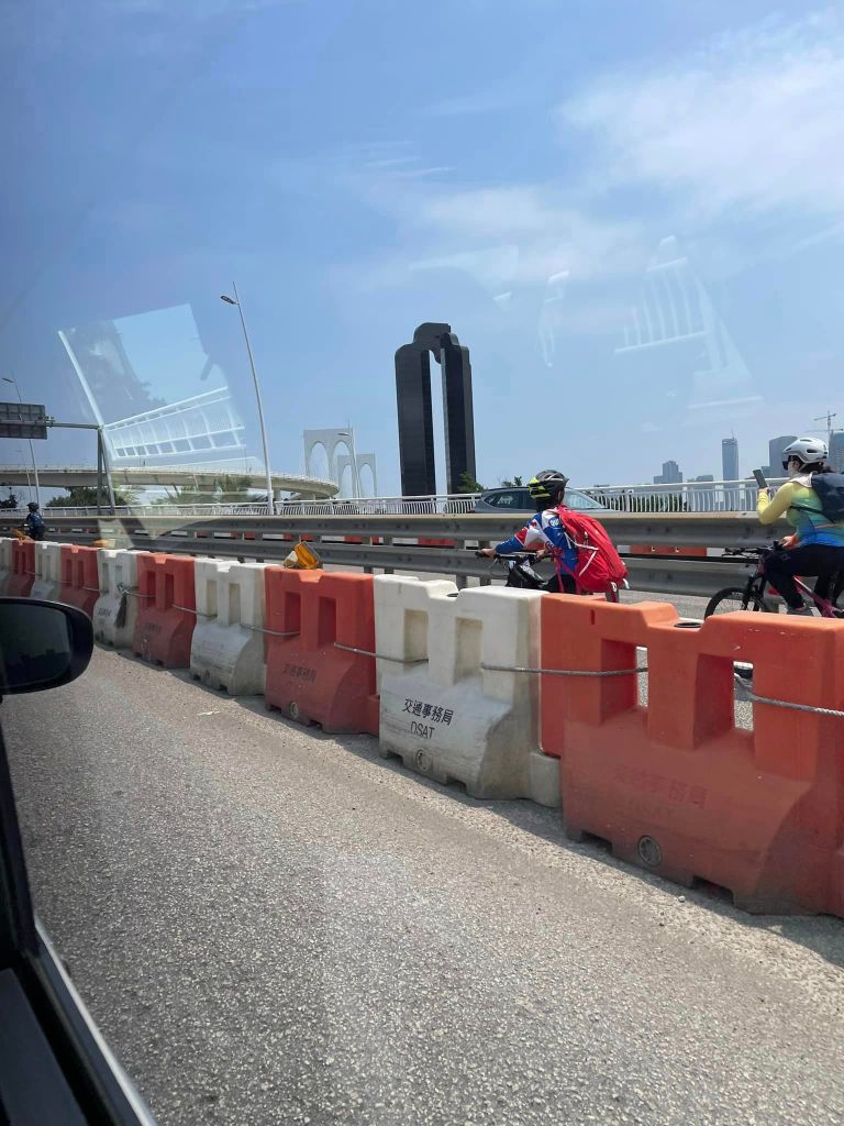 昨日有網民拍攝到有人在西灣大橋往氹仔方向電單車專道內駕駛單車,其中至少有一名小童,各人都戴上頭盔並孭起背包。有一名女子被拍到手持手機,疑似正在進行拍攝。