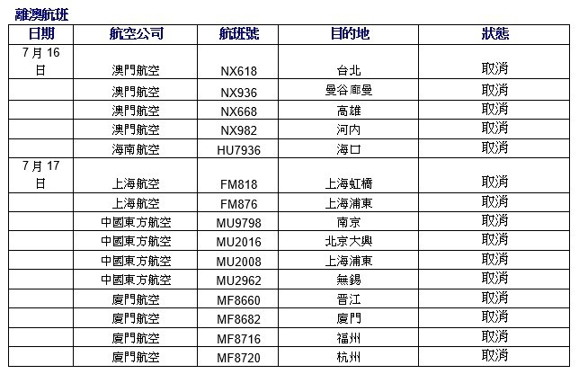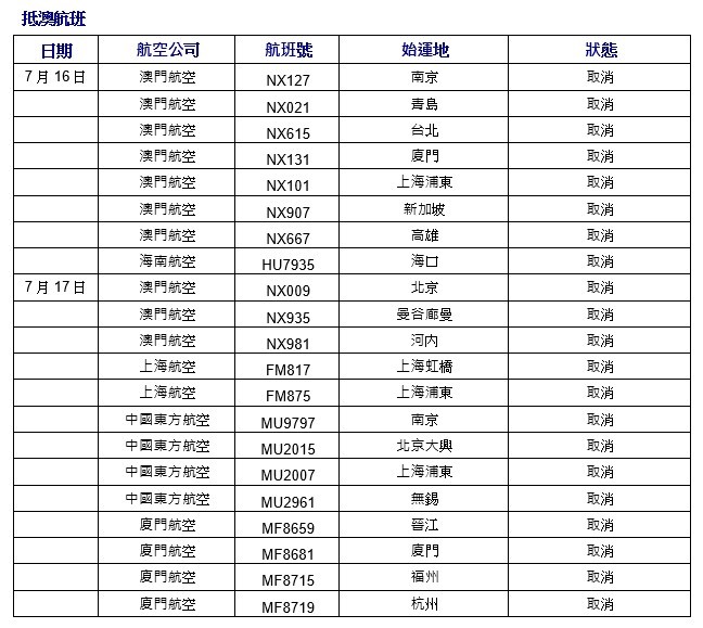 另外截至晚上六時,今明兩日機場下列航班將取消: