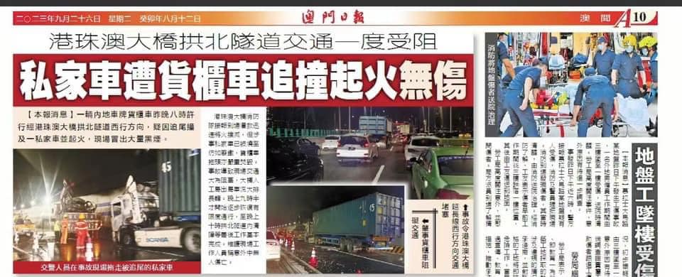 珠海拱北隧道昨晚發生一宗私家車被追撞的交通意外,私家車隨後著火焚燒。經向珠海方面查詢,保安司司長辦公室證實私家車上有本澳居民,其中十歲男童不幸罹難,父親受傷入院治療。