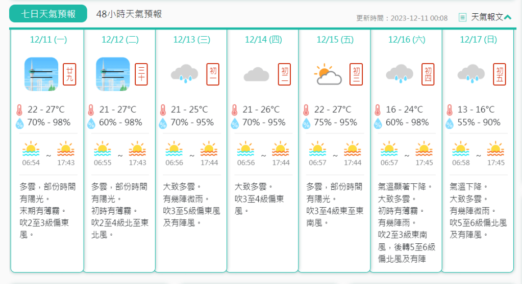 周末將有強烈冬季季風抵達華南沿岸,本澳氣溫將會由星期五最高攝氏27度下降至星期日最低13度。