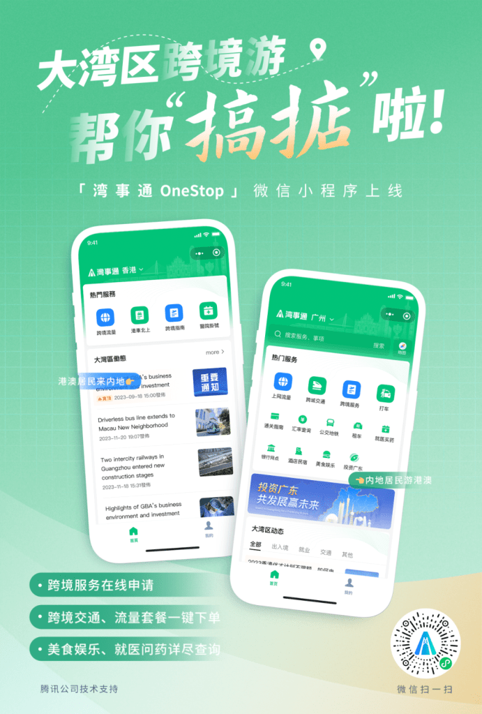 作為「數字灣區」建設三年行動的一部分,由騰訊技術支持的首個大灣區便民出行辦事一站式指尖服務平台——「灣事通OneStop」微信小程式也於近日同步在微信、WeChat式上線。