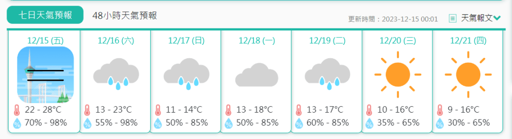 星期六大致多雲、初時有薄霧,有幾陣雨。氣溫顯著下降,氣溫約為13至23度之間,相對濕度55%至98%。