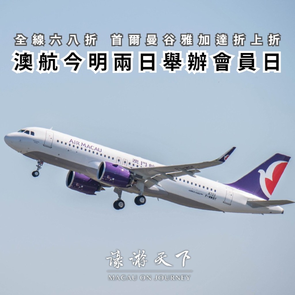 澳門航空今日起一連兩日舉行本年度最後一次會員日。澳門出發全線航線各艙等都享有六八折優惠,部份航線更可享有折上折優惠。