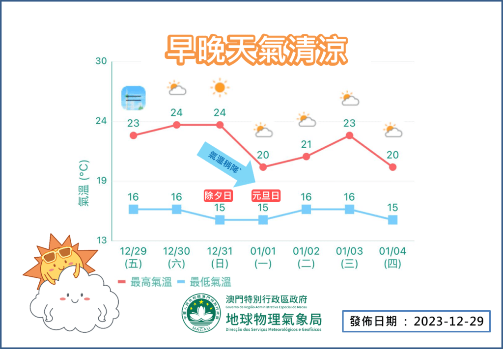 氣象局展望除夕晚間本澳風力將逐漸增強,元旦日起氣溫將稍為下降。未來一周早晚清涼。