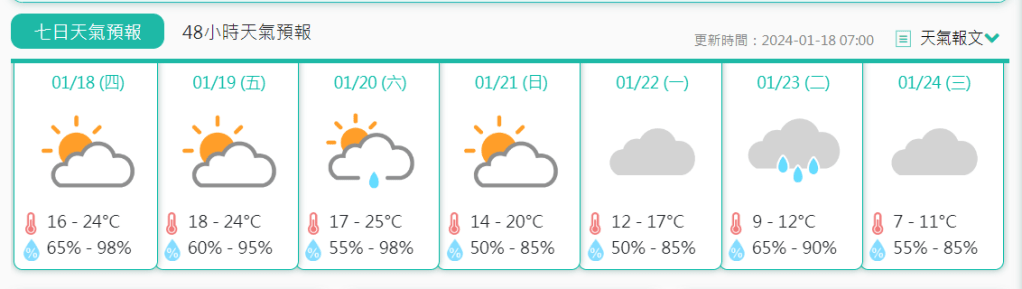 預測周日氣溫下降,下周一最低溫十二度,下周二進一步跌至約九度,周三會再降至七度,天氣嚴寒,大致多雲,吹四至五級偏北風及有陣風。