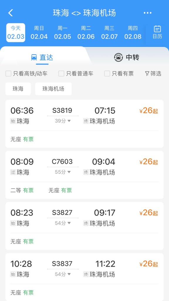 根據12306官網顯示,春運期間,珠機城際鐵路預先鋪排了38對列車的開行方案。今日起,珠機城際與廣珠城際實現連接,廣州南站與珠海機場站的往返城際列車達兩對共四趟,也就是廣珠城際列車,車次字母開通為C);珠機城際區間往返列車達36對共72趟,也就是小交路列車,車次字母開頭為S),珠海站至珠海機場站(經停兩個站)最快時長36分鐘,站站停全程約54分鐘,為往返珠海機場的乘客出行提供了極大的便利。今日最早前往珠海機場的一班列車,早上6時36分在珠海站開出;珠海機場頭班車早上7時30分開出,單程票價26元人民幣。不過「珠海發布」早上7時49分發出的消息指,鐵路要到早上十一時才正式啟用。