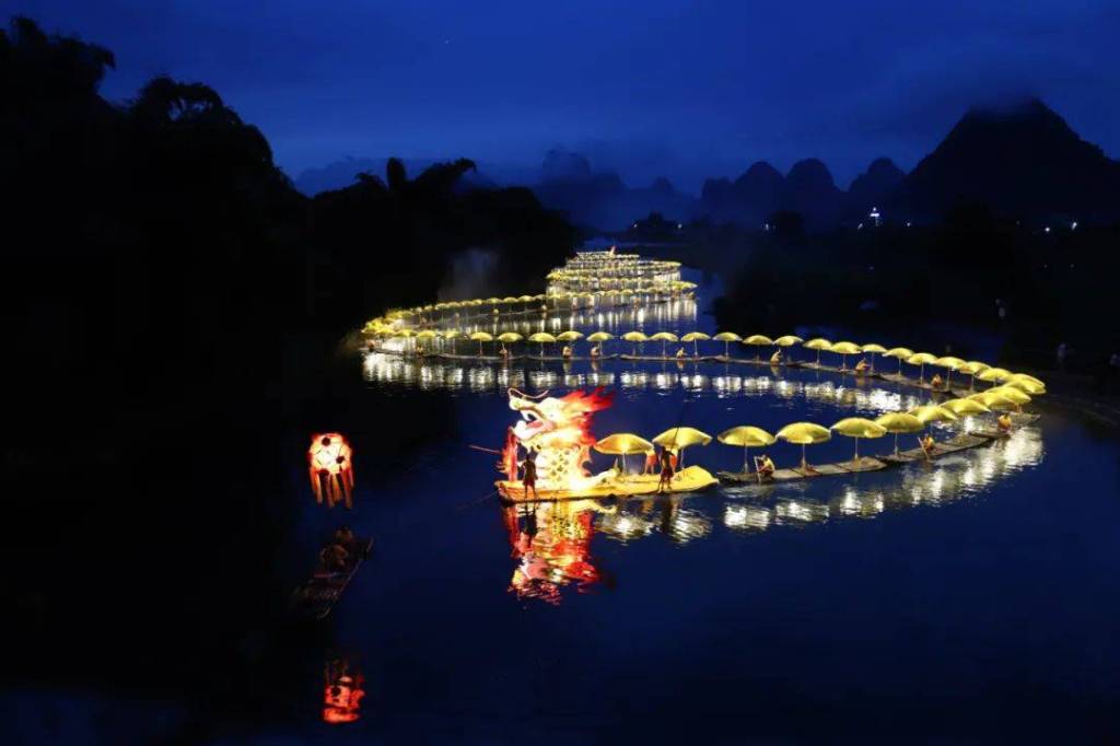 過去兩年,在廣西桂林陽朔縣的遇龍河上,都有利用竹筏製作的「巨龍」在水面上巡遊。金色「巨龍」穿行於山水之間,已經氣勢十足。如遇上大霧迷江,更有騰雲駕霧之感。