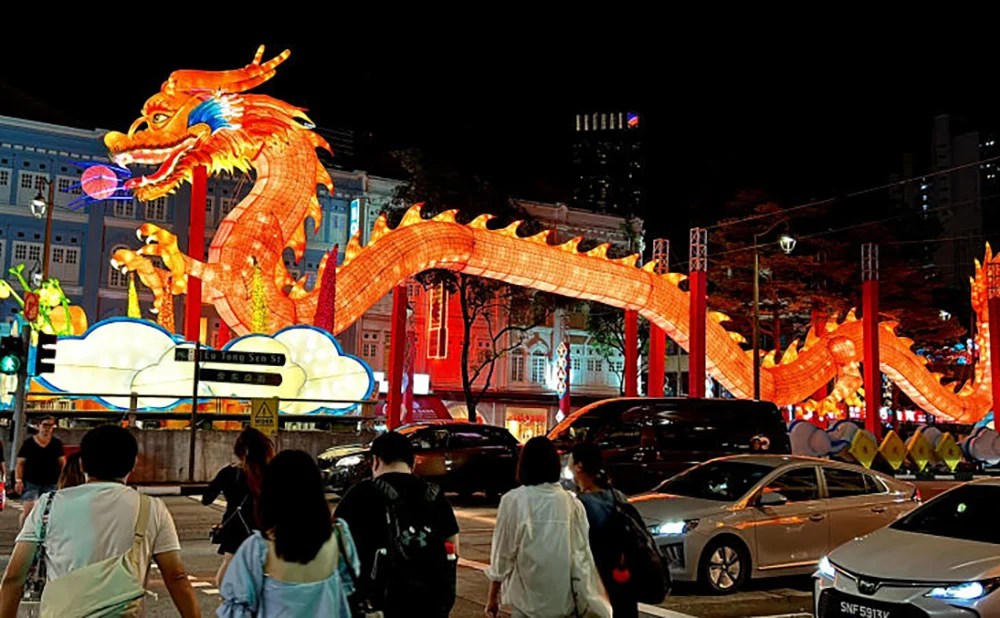 說起全球華人比例最高國家之一的新加坡,當地牛車水(昔日唐人街)的節日裝飾每年都會成為大眾的話題。今年的龍年裝飾也是這樣。今年的龍形裝飾就被指眼睛像人眼,有搞笑的感覺,加上前肢的動作,更讓人有某種聯想。不過也有遊人認為燈飾亮起來後比較有氣勢,是網上照片拍攝角度不佳,才顯得燈飾難看。