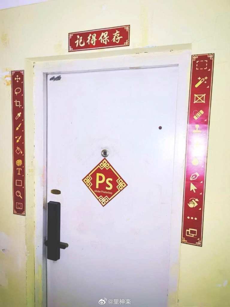 上面的圖片拍攝得不理想,無法看清全部符號。但中間的斗方寫著「Ps」「Adobe Photoshop」,說明這些符號都是Photoshop使用的各種指令。不過還是上面的橫批最重要:記得保存。否則一日的辛勞都會得個「桔」啦!