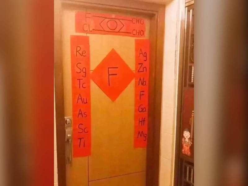 上面的春聯,上下聯分別是「Ag、Zn、Na、F、Ga、Hf、Mg」、「Re、Sg、Tc、Au、As、Sc、Ti」,橫批則寫「F-CL-CHO-CHO」,中間還貼著大大的「F」。