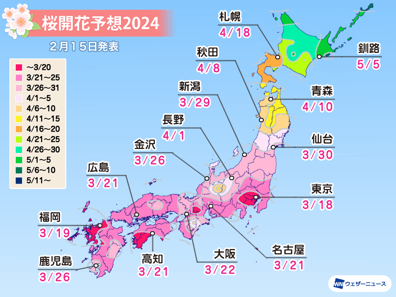 據Weathernews.jp發表的2024年第三次櫻開花預報,今年東京開花的時間是日本全國最早,將會在3月18日,其次是19日的福岡、20日的長崎和橫濱、21日的名古屋,以及22日的大阪。