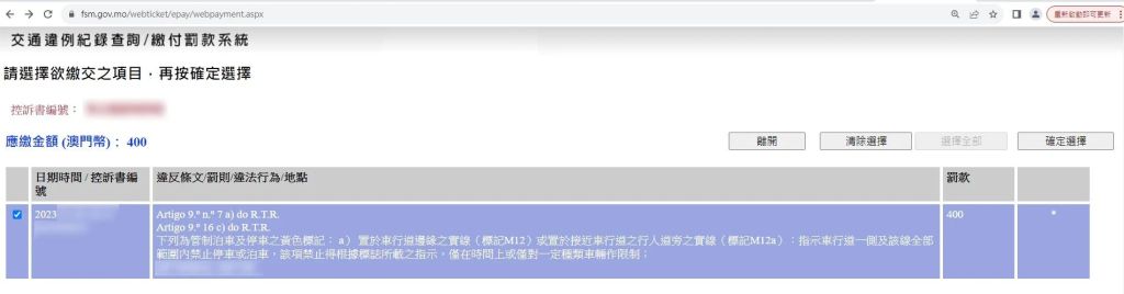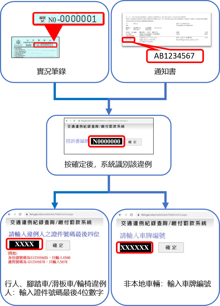 *註:控訴書編號適用於繳付行人、腳踏車/滑板車/輪椅違例人及非本地車輛在港珠澳大橋邊檢大樓東停車場的違例。