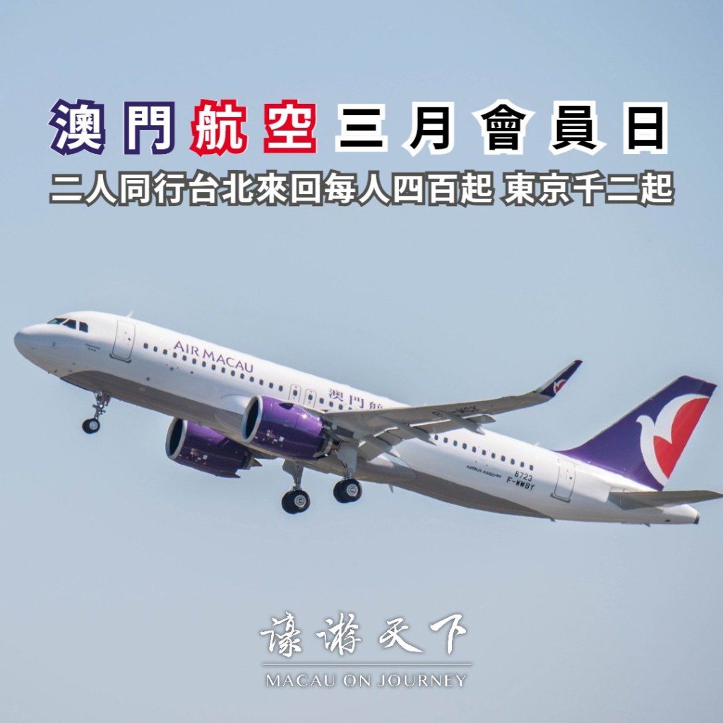 澳門航空明日起一連兩日舉行三月份會員日。訂購澳門出發臺灣地區及國際航線經濟艙可享有五折優惠,二人同行每人更低至澳門幣400元起。
