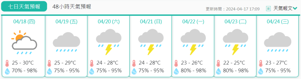 據澳門氣象局七日天氣預報,本澳今日多雲,短暫時間有陽光,有幾陣驟雨。氣溫介乎攝氏25至30度之間。星期五大致多雲、有幾陣驟雨。星期六大致多雲,有幾陣驟雨及雷暴。而雷暴天氣將持續至下星期二。