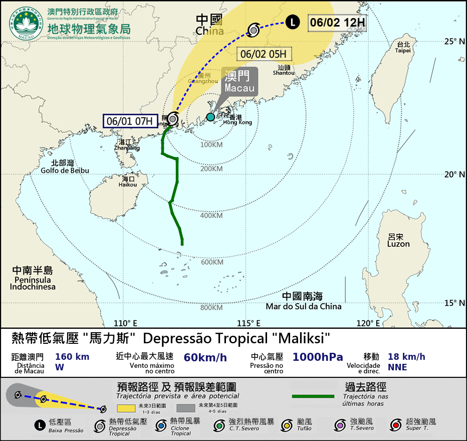 氣象局表示,熱帶風暴「馬力斯」已於凌晨一時在陽江登陸。在早上七時熱帶低氣壓「馬力斯」(2402)集結在本澳以西約160公里,目前正以東北偏北方向移動,發出八號風球的機會不大。 然而,預料當馬力斯移入內陸後,受其偏南氣流相關的強雨帶影響, 6月1日早上本澳風力會維持,雨勢有時頗大,並有雷暴和短時強陣風,單日累積雨量可超過100毫米,低窪地區有機會出現水浸,呼籲市民提早做好預防措施及留意最新天氣資訊。