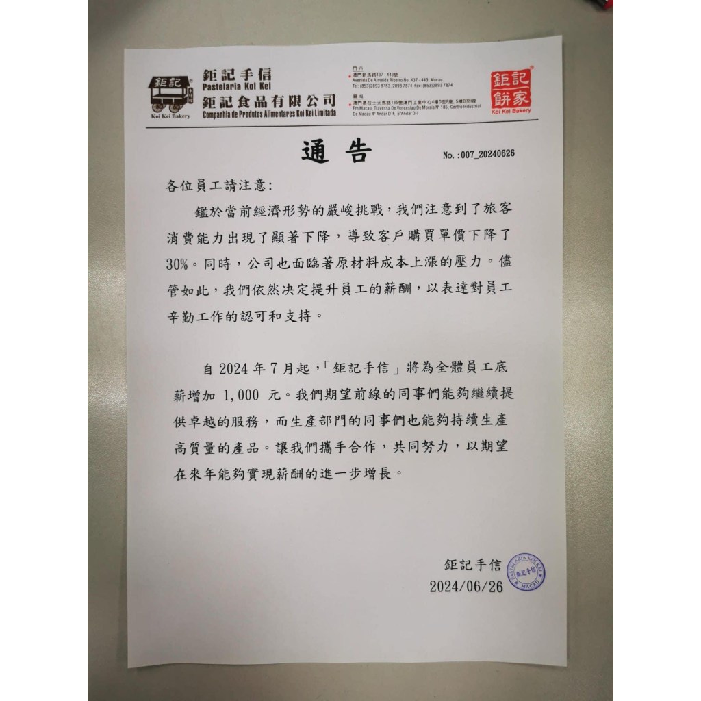 根據社交媒體流傳、鉅記在今日發出的通告指,鑑於當前經濟形勢的嚴峻挑戰,注意到旅客消費能力出現了顯著下降,導致客戶購買單價下降了三成。同時公司也面臨著原材料成本上漲的壓力。儘管如此,公司依然決定提升員工的薪酬,以表達對員工辛勤工作的認可和支持。