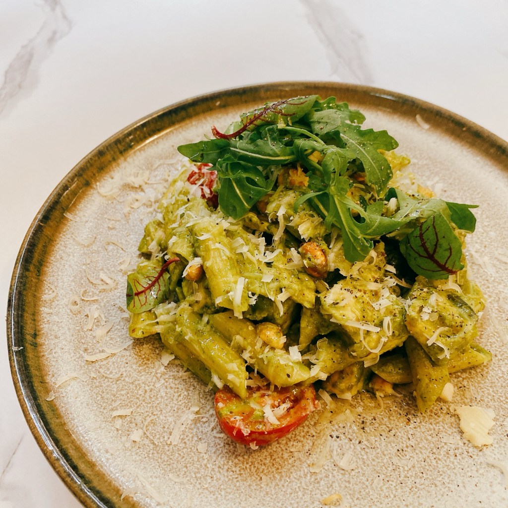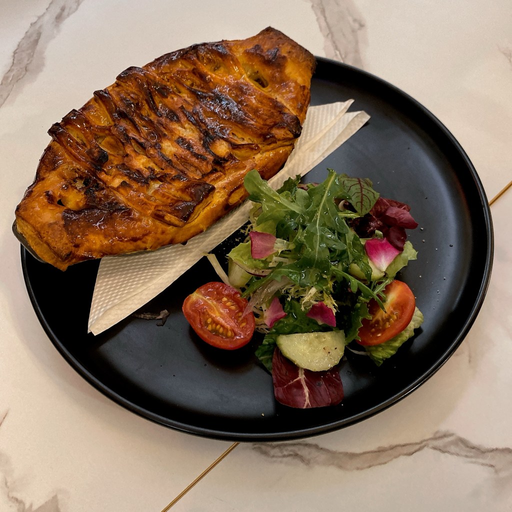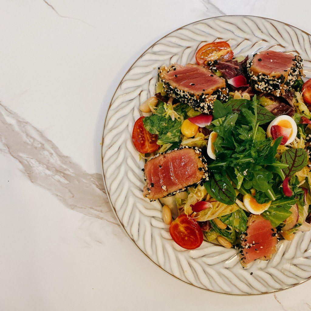 餐廳正推出午市套餐。D亦準備了當中幾款菜式讓我們嚐嚐。首先上菜的是香煎吞拿魚佐鵪鶉蛋白豆沙律。吞拿魚切得厚身,外面包住黑白芝麻,外脆內嫩之餘,配上沙律的紅綠,更有美感。蔬菜有醃製過,軟腍而有味,不是尋常之作。另一道牛肉批看似家常,也是下了很多功夫。尤其是外皮,一打開熱氣騰騰,酥皮的牛油香再升「呢」,就算單獨當牛角包吃,也很正!