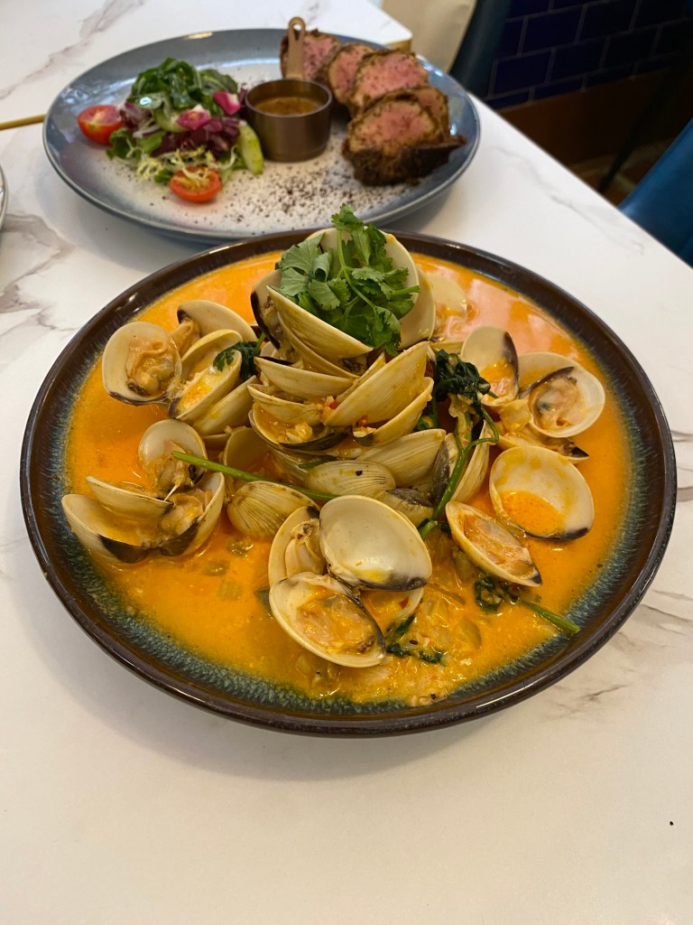 大菜方面,有平常在葡國菜館出現的白酒炒蜆,在這裡加上了一抹溫暖的顏色:橙黃色的非洲醬汁看似咖哩但不辣,但為炒蜆增加了新的口感。而醬汁的運用,也是D說的,非洲菜的創意所在。不變的是,炒蜆旁邊應該有一盆麵包,做到「汁都撈埋」!